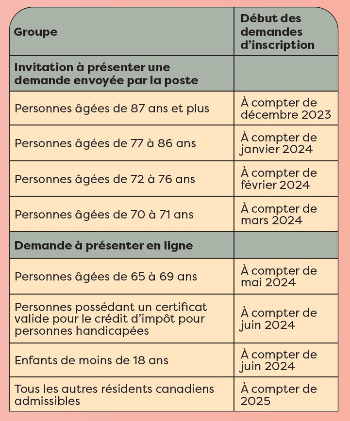 Vous pouvez faire une demande au Régime canadien de soins dentaires seulement si vous avez reçu une lettre vous invitant à le faire. Les lettres seront envoyées par étapes aux personnes de 70 ans et plus qui pourraient être admissibles, en commençant par celles de 87 ans et plus, de décembre 2023 à mars 2024.